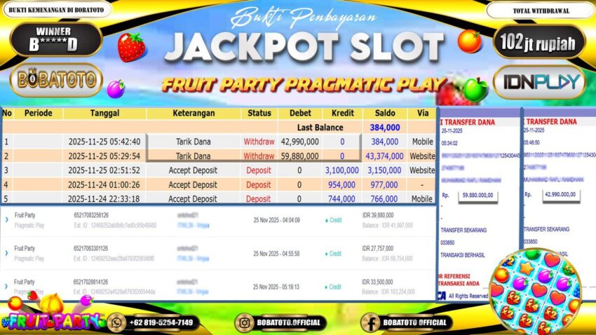 BOBATOTO – Selamat kepada User id : B*****D Telah berhasil mendapatkan kemenangan besar pada permainan SLOT FRUIT PARTY Dengan kemenangan Sebesar Rp.102,000,000,-. Setelah mengisi formulir withdraw dengan kurung waktu hanya 5 – 10 menit pihak bobatoto sudah melakukan transfer kepada pemilik Userid dan dana sudah dapat di cairkan oleh pemenang. Bukti pembayaran yang kami berikan merupakan bukti pembayaran yang SAH / VALID yang langung di dapatkan melaui tanda transfer transaksi dari Bank yang di tuju.