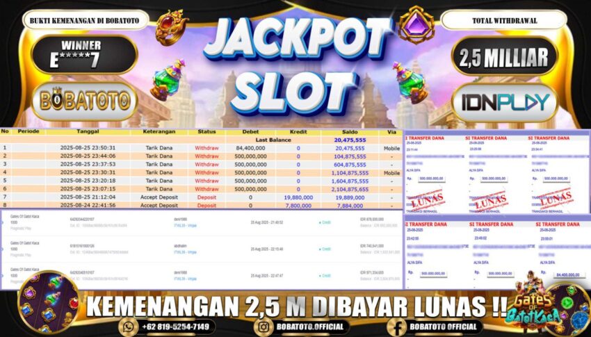 BOBATOTO – Selamat kepada User id : E*****7 Telah berhasil mendapatkan kemenangan besar pada permainan  SLOT PRAGMATIC GATES OF GATOT KACA 1000 Dengan kemenangan Sebesar Rp.2,500,000,000,-. Setelah mengisi formulir withdraw dengan kurung waktu hanya 5 – 10 menit pihak bobatoto sudah melakukan transfer kepada pemilik Userid dan dana sudah dapat di cairkan oleh pemenang. Bukti pembayaran yang kami berikan merupakan bukti pembayaran yang SAH / VALID yang langung di dapatkan melaui tanda transfer transaksi dari Bank yang di tuju.