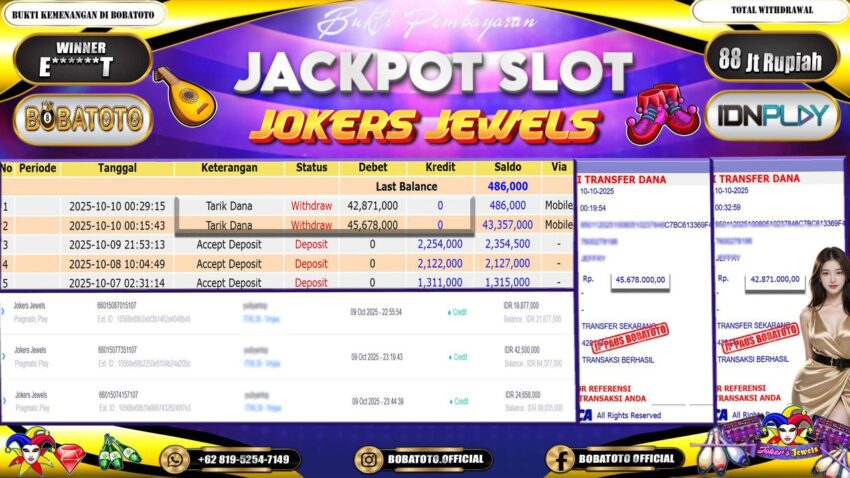 BOBATOTO – Selamat kepada User id : E******T Telah berhasil mendapatkan kemenangan besar pada permainan  SLOT JOKERS JEWELS  Dengan kemenangan Sebesar Rp.88,000,000,-. Setelah mengisi formulir withdraw dengan kurung waktu hanya 5 – 10 menit pihak bobatoto sudah melakukan transfer kepada pemilik Userid dan dana sudah dapat di cairkan oleh pemenang. Bukti pembayaran yang kami berikan merupakan bukti pembayaran yang SAH / VALID yang langung di dapatkan melaui tanda transfer transaksi dari Bank yang di tuju.