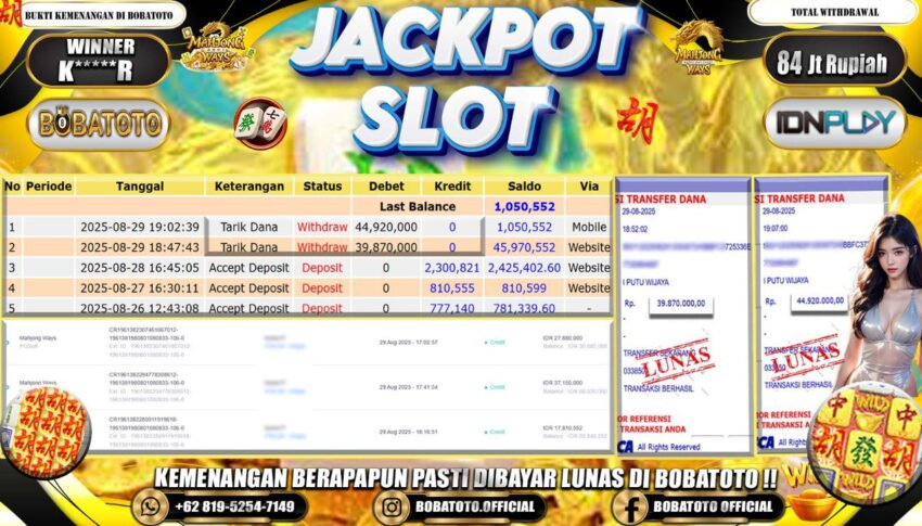 BOBATOTO – Selamat kepada User id :K*****R Telah berhasil mendapatkan kemenangan besar pada permainan  SLOT MAHJONG WAYS  Dengan kemenangan Sebesar Rp.84,000,000-. Setelah mengisi formulir withdraw dengan kurung waktu hanya 5 – 10 menit pihak bobatoto sudah melakukan transfer kepada pemilik Userid dan dana sudah dapat di cairkan oleh pemenang. Bukti pembayaran yang kami berikan merupakan bukti pembayaran yang SAH / VALID yang langung di dapatkan melaui tanda transfer transaksi dari Bank yang di tuju.