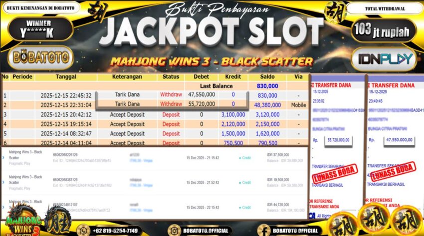 BOBATOTO – Selamat kepada User id : Y*****K Telah berhasil mendapatkan kemenangan besar pada permainan SLOT MAHJONG WINS-3 BLACK SCATTER Dengan kemenangan Sebesar Rp.103,000,000-. Setelah mengisi formulir withdraw dengan kurung waktu hanya 5 – 10 menit pihak bobatoto sudah melakukan transfer kepada pemilik Userid dan dana sudah dapat di cairkan oleh pemenang. Bukti pembayaran yang kami berikan merupakan bukti pembayaran yang SAH / VALID yang langung di dapatkan melaui tanda transfer transaksi dari Bank yang di tuju.