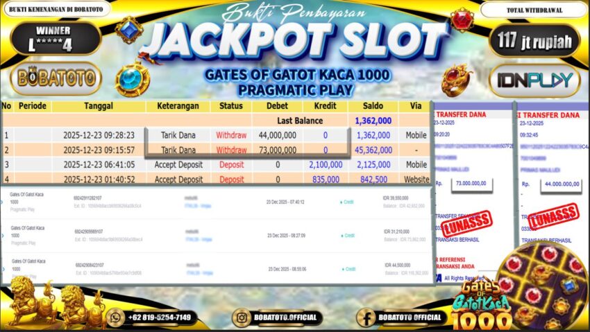 BOBATOTO – Selamat kepada User id : l*****4 Telah berhasil mendapatkan kemenangan besar pada permainan SLOT PRAGMATIC GATES OF GATOT KACA 1000 Dengan kemenangan Sebesar Rp.117,000,000,-. Setelah mengisi formulir withdraw dengan kurung waktu hanya 5 – 10 menit pihak bobatoto sudah melakukan transfer kepada pemilik Userid dan dana sudah dapat di cairkan oleh pemenang. Bukti pembayaran yang kami berikan merupakan bukti pembayaran yang SAH / VALID yang langung di dapatkan melaui tanda transfer transaksi dari Bank yang di tuju.