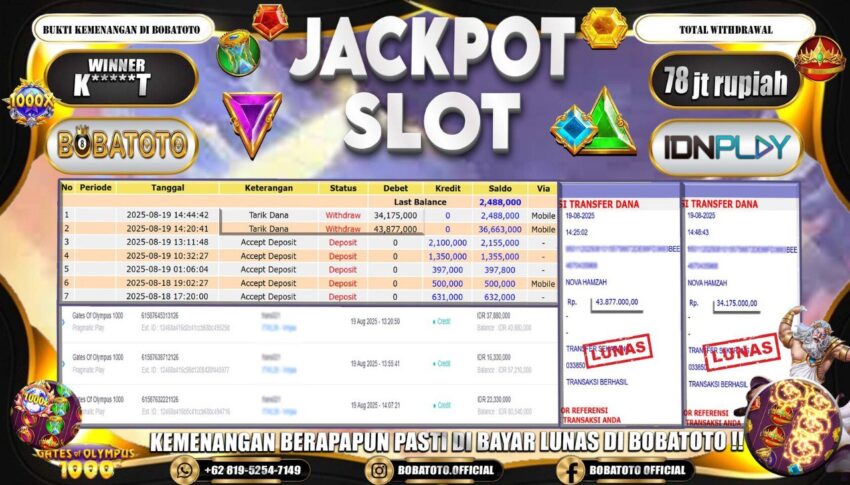 BOBATOTO – Selamat kepada User id : K*****T Telah berhasil mendapatkan kemenangan besar pada permainan  SLOT PRAGMATIC GATES OF OLYMPUS 1000  Dengan kemenangan Sebesar Rp.78,000,000,-. Setelah mengisi formulir withdraw dengan kurung waktu hanya 5 – 10 menit pihak bobatoto sudah melakukan transfer kepada pemilik Userid dan dana sudah dapat di cairkan oleh pemenang. Bukti pembayaran yang kami berikan merupakan bukti pembayaran yang SAH / VALID yang langung di dapatkan melaui tanda transfer transaksi dari Bank yang di tuju.