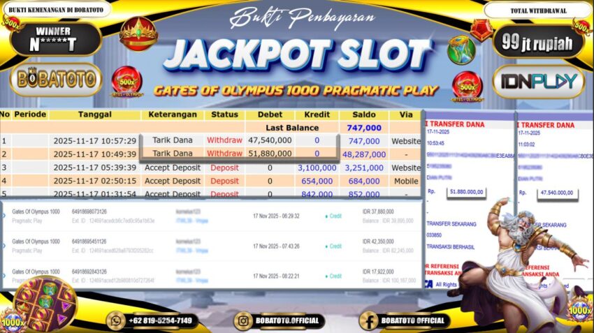 BOBATOTO – Selamat kepada User id : N*****T Telah berhasil mendapatkan kemenangan besar pada permainan SLOT PRAGMATIC GATES OF OLYMPUS 1000 Dengan kemenangan Sebesar Rp.99,000,000,-. Setelah mengisi formulir withdraw dengan kurung waktu hanya 5 – 10 menit pihak bobatoto sudah melakukan transfer kepada pemilik Userid dan dana sudah dapat di cairkan oleh pemenang. Bukti pembayaran yang kami berikan merupakan bukti pembayaran yang SAH / VALID yang langung di dapatkan melaui tanda transfer transaksi dari Bank yang di tuju.