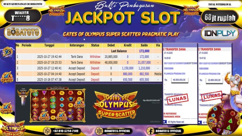 BOBATOTO JACKPOT SLOT PRAGMATIC GATES OF OLYMPUS SUPER SCATTER Rp.68,000,000,- LUNAS!!