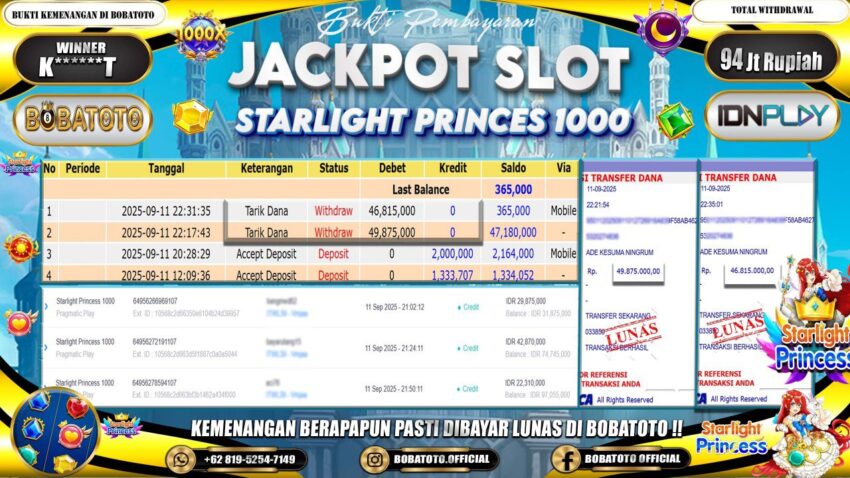 BOBATOTO – Selamat kepada User id : K******T Telah berhasil mendapatkan kemenangan besar pada permainan SLOT STARLIGHT PRINCES 1000 Dengan kemenangan Sebesar Rp.94,000,000,-. Setelah mengisi formulir withdraw dengan kurung waktu hanya 5 – 10 menit pihak bobatoto sudah melakukan transfer kepada pemilik Userid dan dana sudah dapat di cairkan oleh pemenang. Bukti pembayaran yang kami berikan merupakan bukti pembayaran yang SAH / VALID yang langung di dapatkan melaui tanda transfer transaksi dari Bank yang di tuju.
