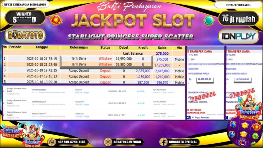 BOBATOTO – Selamat kepada User id : S*****D Telah berhasil mendapatkan kemenangan besar pada permainan SLOT STARLIGHT PRINCES SUPER SCATTER Dengan kemenangan Sebesar Rp.76,000,000,-. Setelah mengisi formulir withdraw dengan kurung waktu hanya 5 – 10 menit pihak bobatoto sudah melakukan transfer kepada pemilik Userid dan dana sudah dapat di cairkan oleh pemenang. Bukti pembayaran yang kami berikan merupakan bukti pembayaran yang SAH / VALID yang langung di dapatkan melaui tanda transfer transaksi dari Bank yang di tuju.