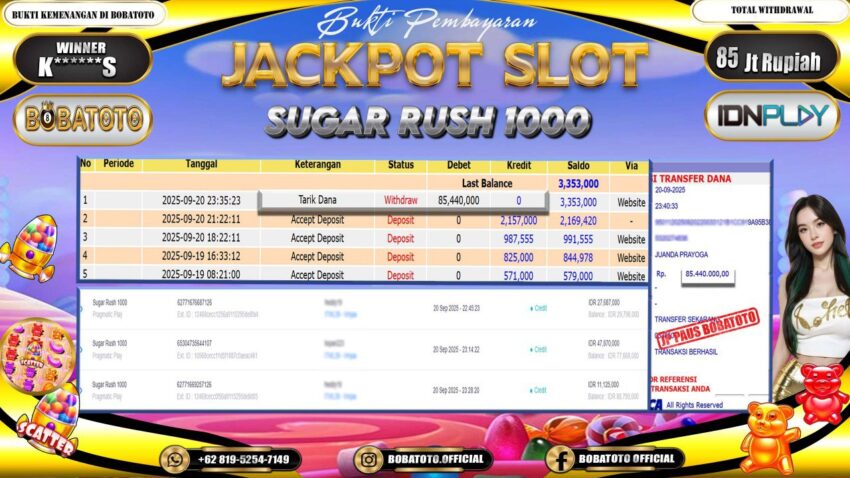 BOBATOTO – Selamat kepada User id : K*****S Telah berhasil mendapatkan kemenangan besar pada permainan  SLOT PRAGMATIC SUGAR RUSH 1000 Dengan kemenangan Sebesar Rp.85,000,000,-. Setelah mengisi formulir withdraw dengan kurung waktu hanya 5 – 10 menit pihak bobatoto sudah melakukan transfer kepada pemilik Userid dan dana sudah dapat di cairkan oleh pemenang. Bukti pembayaran yang kami berikan merupakan bukti pembayaran yang SAH / VALID yang langung di dapatkan melaui tanda transfer transaksi dari Bank yang di tuju.