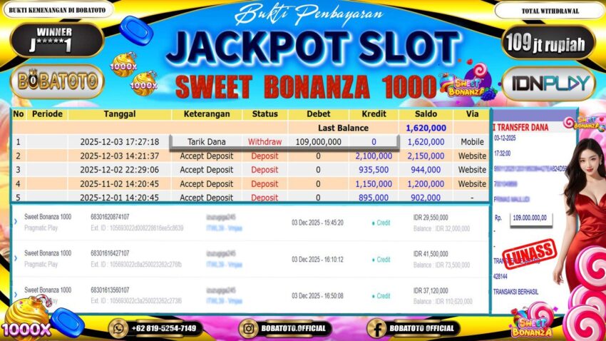 BOBATOTO – Selamat kepada User id : J*****1 Telah berhasil mendapatkan kemenangan besar pada permainan  SLOT SWEET BONANZA 1000  Dengan kemenangan Sebesar Rp.109,000,000,-. Setelah mengisi formulir withdraw dengan kurung waktu hanya 5 – 10 menit pihak bobatoto sudah melakukan transfer kepada pemilik Userid dan dana sudah dapat di cairkan oleh pemenang. Bukti pembayaran yang kami berikan merupakan bukti pembayaran yang SAH / VALID yang langung di dapatkan melaui tanda transfer transaksi dari Bank yang di tuju.