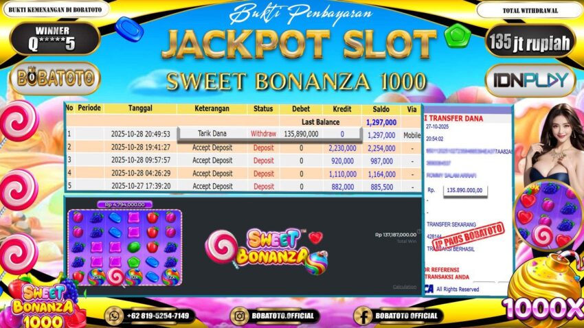 BOBATOTO – Selamat kepada User id : Q*****5 Telah berhasil mendapatkan kemenangan besar pada permainan SLOT SWEET BONANZA 1000 Dengan kemenangan Sebesar Rp.135,000,000,-. Setelah mengisi formulir withdraw dengan kurung waktu hanya 5 – 10 menit pihak bobatoto sudah melakukan transfer kepada pemilik Userid dan dana sudah dapat di cairkan oleh pemenang. Bukti pembayaran yang kami berikan merupakan bukti pembayaran yang SAH / VALID yang langung di dapatkan melaui tanda transfer transaksi dari Bank yang di tuju.