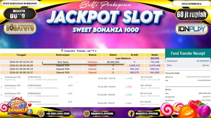 BOBATOTO – Selamat kepada User id : UU**9 Telah berhasil mendapatkan kemenangan besar pada permainan SLOT SWEET BONANZA 1000 Dengan kemenangan Sebesar Rp.60,000,000,-. Setelah mengisi formulir withdraw dengan kurung waktu hanya 5 – 10 menit pihak bobatoto sudah melakukan transfer kepada pemilik Userid dan dana sudah dapat di cairkan oleh pemenang. Bukti pembayaran yang kami berikan merupakan bukti pembayaran yang SAH / VALID yang langung di dapatkan melaui tanda transfer transaksi dari Bank yang di tuju.