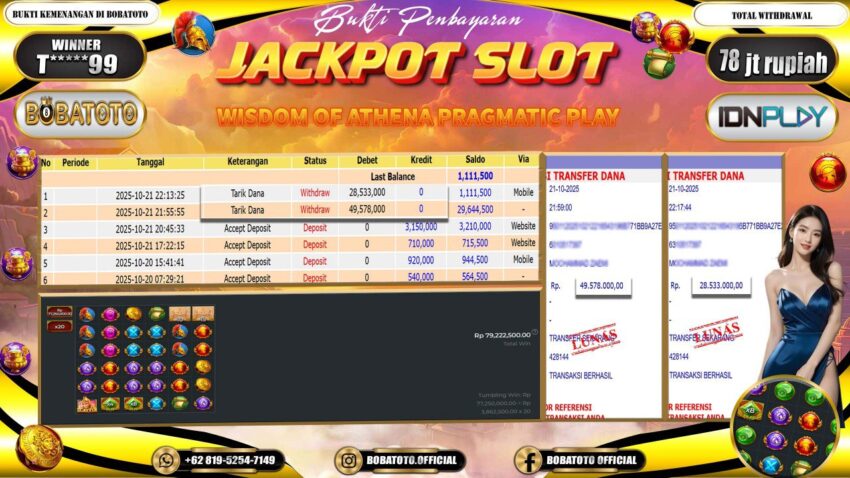 BOBATOTO – Selamat kepada User id : T*****99 Telah berhasil mendapatkan kemenangan besar pada permainan SLOT WISDOM OF ATHENA Dengan kemenangan Sebesar Rp.78,000,000,-. Setelah mengisi formulir withdraw dengan kurung waktu hanya 5 – 10 menit pihak bobatoto sudah melakukan transfer kepada pemilik Userid dan dana sudah dapat di cairkan oleh pemenang. Bukti pembayaran yang kami berikan merupakan bukti pembayaran yang SAH / VALID yang langung di dapatkan melaui tanda transfer transaksi dari Bank yang di tuju.