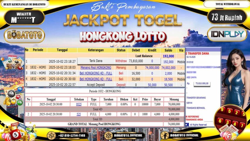 BOBATOTO – Selamat kepada User id : M******T Telah berhasil mendapatkan kemenangan besar pada permainan TOGEL HONGKONG LOTTO Dengan kemenangan Sebesar Rp.73,000,000,-. Setelah mengisi formulir withdraw dengan kurung waktu hanya 5 – 10 menit pihak bobatoto sudah melakukan transfer kepada pemilik Userid dan dana sudah dapat di cairkan oleh pemenang. Bukti pembayaran yang kami berikan merupakan bukti pembayaran yang SAH / VALID yang langung di dapatkan melaui tanda transfer transaksi dari Bank yang di tuju.