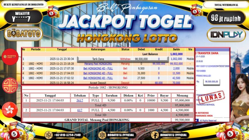 BOBATOTO – Selamat kepada User id : Y*****7 Telah berhasil mendapatkan kemenangan besar pada permainan TOGEL HONGKONG LOTTO Dengan kemenangan Sebesar Rp.98,000,000,-. Setelah mengisi formulir withdraw dengan kurung waktu hanya 5 – 10 menit pihak bobatoto sudah melakukan transfer kepada pemilik Userid dan dana sudah dapat di cairkan oleh pemenang. Bukti pembayaran yang kami berikan merupakan bukti pembayaran yang SAH / VALID yang langung di dapatkan melaui tanda transfer transaksi dari Bank yang di tuju.