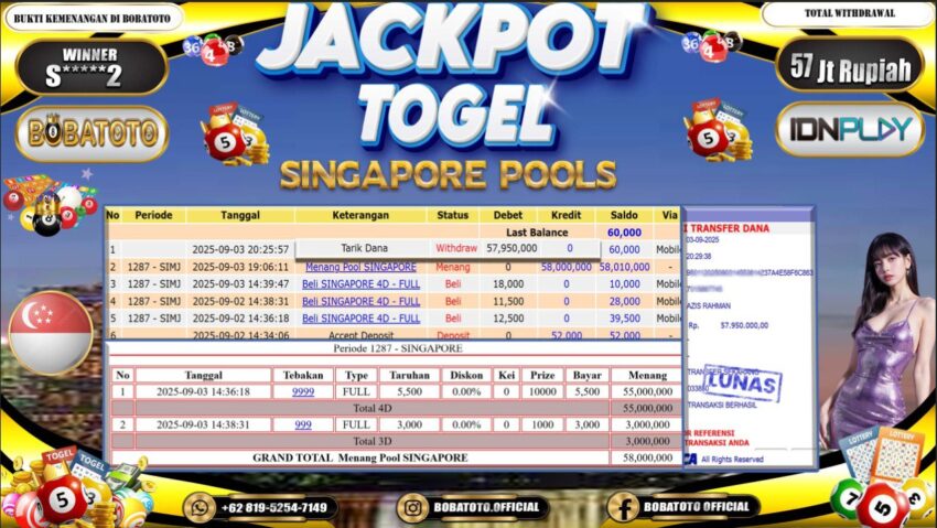 BOBATOTO – Selamat kepada User id : S*****2 Telah berhasil mendapatkan kemenangan besar pada permainan TOGEL SINGAPORE Dengan kemenangan Sebesar Rp.57,000,000,-. Setelah mengisi formulir withdraw dengan kurung waktu hanya 5 – 10 menit pihak bobatoto sudah melakukan transfer kepada pemilik Userid dan dana sudah dapat di cairkan oleh pemenang. Bukti pembayaran yang kami berikan merupakan bukti pembayaran yang SAH / VALID yang langung di dapatkan melaui tanda transfer transaksi dari Bank yang di tuju.