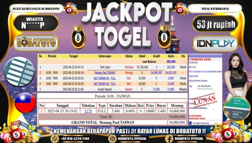 BOBATOTO – Selamat kepada User id : N*****P Telah berhasil mendapatkan kemenangan besar pada permainan TOGEL TAIWAN Dengan kemenangan Sebesar Rp.53,000,000,-. Setelah mengisi formulir withdraw dengan kurung waktu hanya 5 – 10 menit pihak bobatoto sudah melakukan transfer kepada pemilik Userid dan dana sudah dapat di cairkan oleh pemenang. Bukti pembayaran yang kami berikan merupakan bukti pembayaran yang SAH / VALID yang langung di dapatkan melaui tanda transfer transaksi dari Bank yang di tuju.
