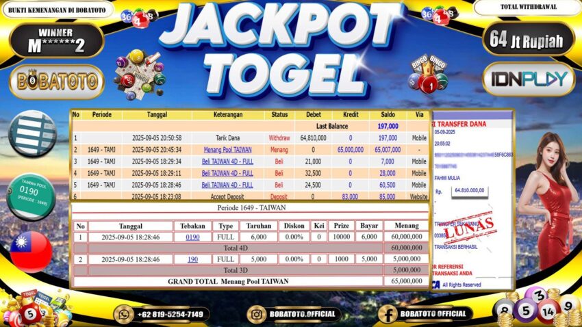 BOBATOTO – Selamat kepada User id : M******2 Telah berhasil mendapatkan kemenangan besar pada permainan TOGEL TAIWAN Dengan kemenangan Sebesar Rp.64,000,000,-. Setelah mengisi formulir withdraw dengan kurung waktu hanya 5 – 10 menit pihak bobatoto sudah melakukan transfer kepada pemilik Userid dan dana sudah dapat di cairkan oleh pemenang. Bukti pembayaran yang kami berikan merupakan bukti pembayaran yang SAH / VALID yang langung di dapatkan melaui tanda transfer transaksi dari Bank yang di tuju.