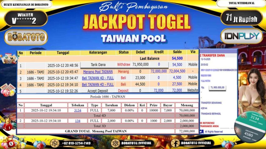 BOBATOTO – Selamat kepada User id : v******2 Telah berhasil mendapatkan kemenangan besar pada permainan TOGEL TAIWAN Dengan kemenangan Sebesar Rp.71,000,000,-. Setelah mengisi formulir withdraw dengan kurung waktu hanya 5 – 10 menit pihak bobatoto sudah melakukan transfer kepada pemilik Userid dan dana sudah dapat di cairkan oleh pemenang. Bukti pembayaran yang kami berikan merupakan bukti pembayaran yang SAH / VALID yang langung di dapatkan melaui tanda transfer transaksi dari Bank yang di tuju.